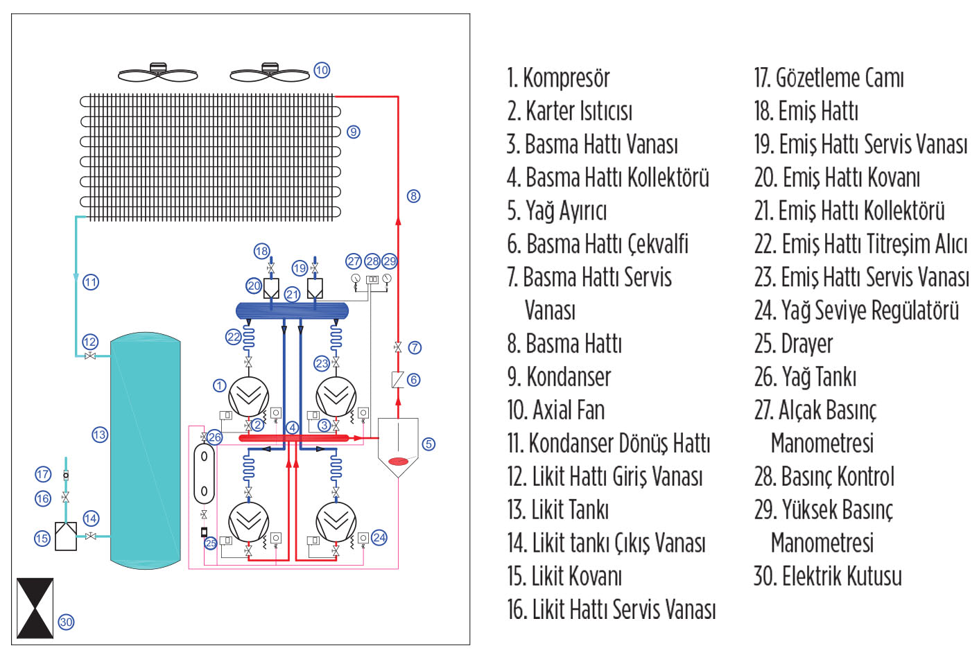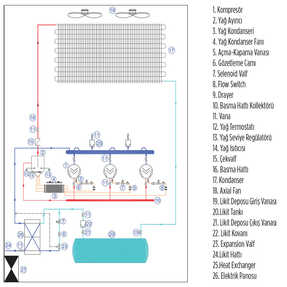 Merkezi soğutma üniteleri, dayanıklı bir şasi üzerine titreşim sönümleyici elemanlar ile birden fazla hermetik, yarı-hermetik veya scroll kompresörler kullanılarak kompresölerin paralel çalışması sağlanacak şekilde üretilmektedir.Yüksek kapasiteli kompresörlerin kullanıldığı soğutma cihazlarında verimlilik üst seviyededir.